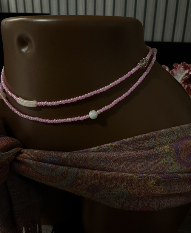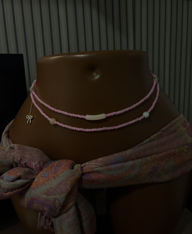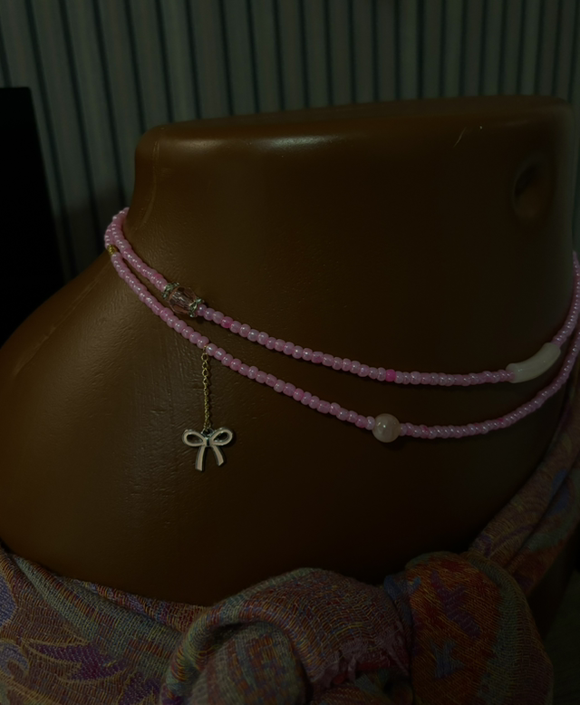 Adoptez un style chic en toute saison avec cette chaîne de taille en fines perles roses, rehaussée d’un centre blanc et d’une breloque nœud papillon🌸